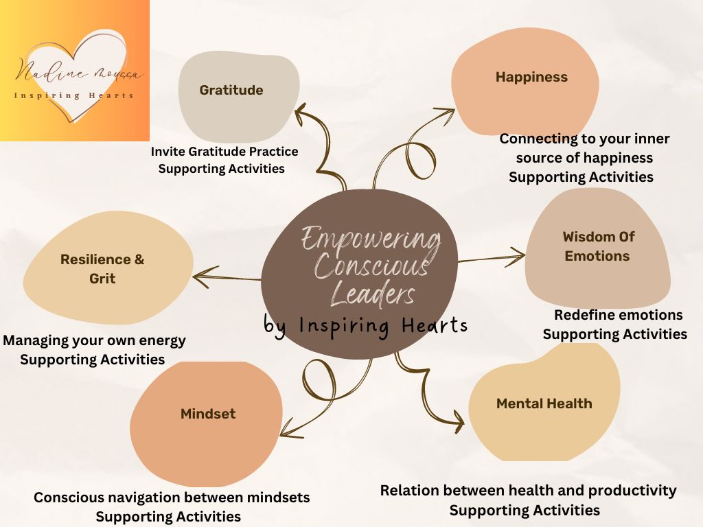 Nadine has workshops targeting the empowerment of conscious leaders. Her workshops address several key subjects: gratitude, happiness, mental health and wellbeing, mindset, resilience and grit. All her programs involve storytelling and exercises delivering an experiential interactive fun learning experience.